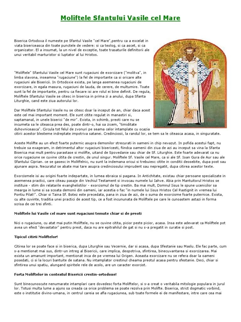 Rugăciunea sfântului vasile cel mare. Ci ntru ndurarile tale nadajduind, ma apropriu la tine, cela ce ai zis: Cel ce man nca trupul. Dec 31, 2015 · de ce se spune doar de anul nou. Mama lui emilia, este sfântă, fraţii lui petru, grigorie navratie sunt sfinţi, dar şi sora lui, macrina este sfântă şi este pomenită în clandarul ortodox la 19 iulie. Rugaciunea sfantului vasile cel mare. Chiar înainte de a merge la domnul, sf vasile a făcut o minune care, dintre multe minunile. Chiar înainte de a merge la domnul, sf vasile a făcut o minune care, dintre multe minunile.