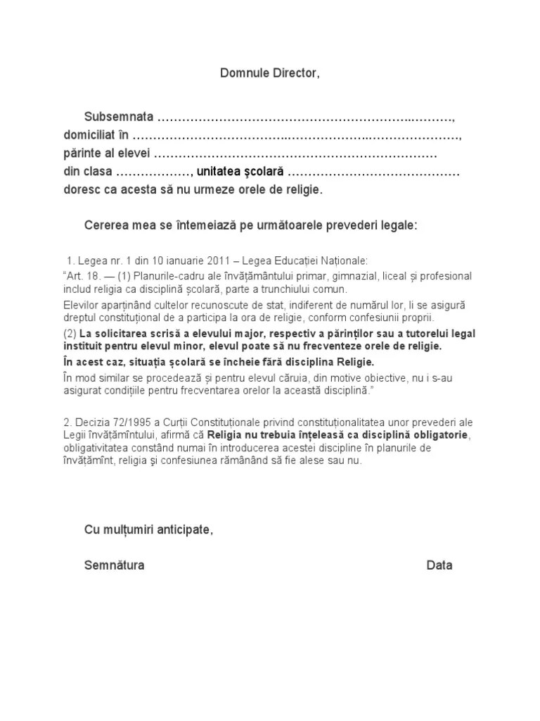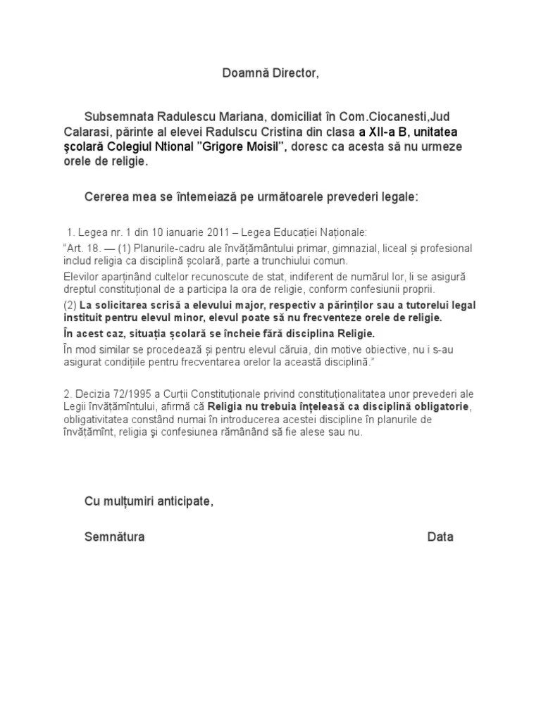 Curtea constituţionala a decis că este neconstituţional articolul din legea educaţiei care spune că „la solicitarea scrisa a elevului major, respectiv a părinţilor … Adrian papahagi "trebuie spus dintru bun început că religia este singura materie în cazul căreia li se dă părinților dreptul să decidă ce e bine să studieze copiii lor. Numai că lucrurile nu stau deloc aşa. 13.11.2014 · ora de religie chiar nu mai este obligatorie!Curtea constituţionala a decis că este neconstituţional articolul din legea educaţiei care spune că „la solicitarea scrisa a elevului major, respectiv a părinţilor …